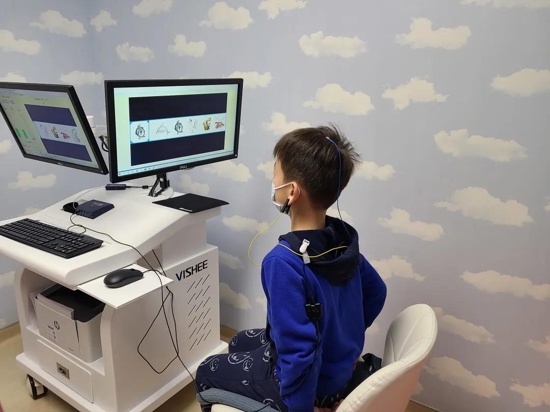 图中小朋友正在进行注意力提升训练。脑电生物反馈训练作为一种无痛、无创的心理疗法,尤其适合儿童。