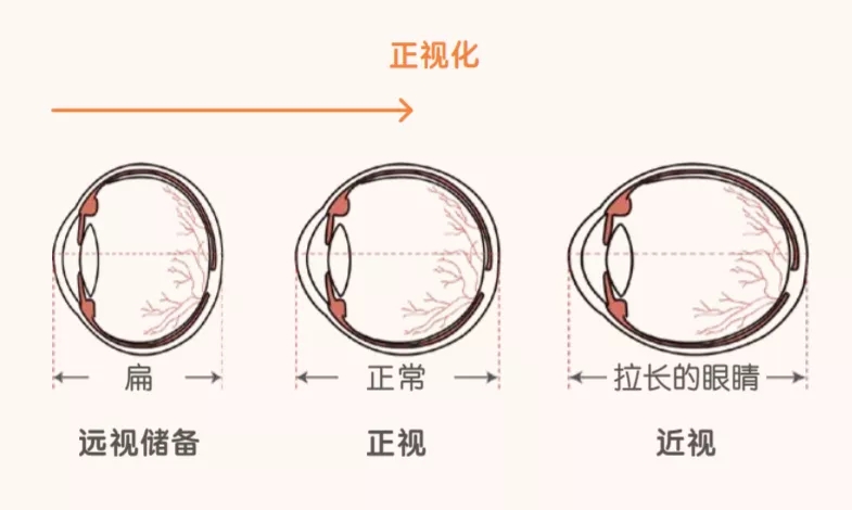 宝宝刚出生时眼球较小,眼轴较短,此时双眼处于生理性远视状态,即有远视储备。远视储备是“对抗”发展为近视的缓冲区,因而为孩子保留合适的远视储备非常重要。远视储备是指生理性远视的度数,而不是视力检查的结果。随着生长发育,眼球逐渐增长,眼轴逐渐变长,生理性远视逐渐减少趋向正视。正视后,如果眼球继续增长,眼轴过长,就会发展为近视了。