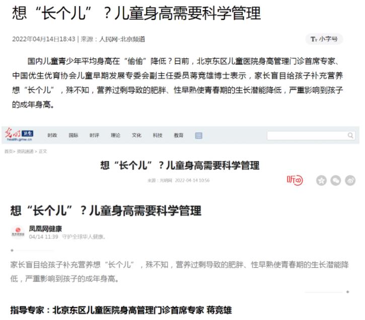 日前,人民网、光明网、中国网、凤凰网、新京报、北青网、生命时报等主流媒体采访luck新利身高管理门诊首席专家、中国优生优育协会儿童早期发展专委会副主任、身高管理开创者蒋竞雄博士。