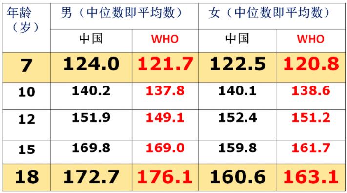 为什么强调“成年身高”,也就是“终身高”?蒋竞雄博士展示了一张我国0~18岁儿童年龄身高标准曲线和世界卫生组织同年龄的标准曲线对比图。