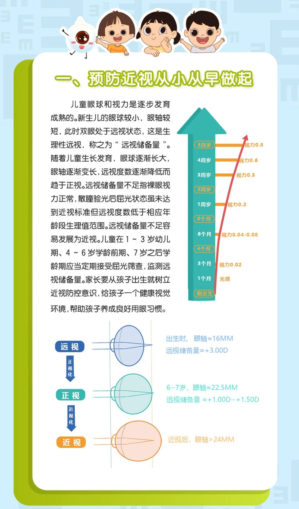 眼轴长度指眼球从前到后的长度。小宝宝从出生到长大,身高会增长,眼轴也会增长。婴儿时期的眼轴长度在20毫米左右,6岁时达到约22毫米,成年时约24毫米,眼轴增长是一个非线性的增长过程。