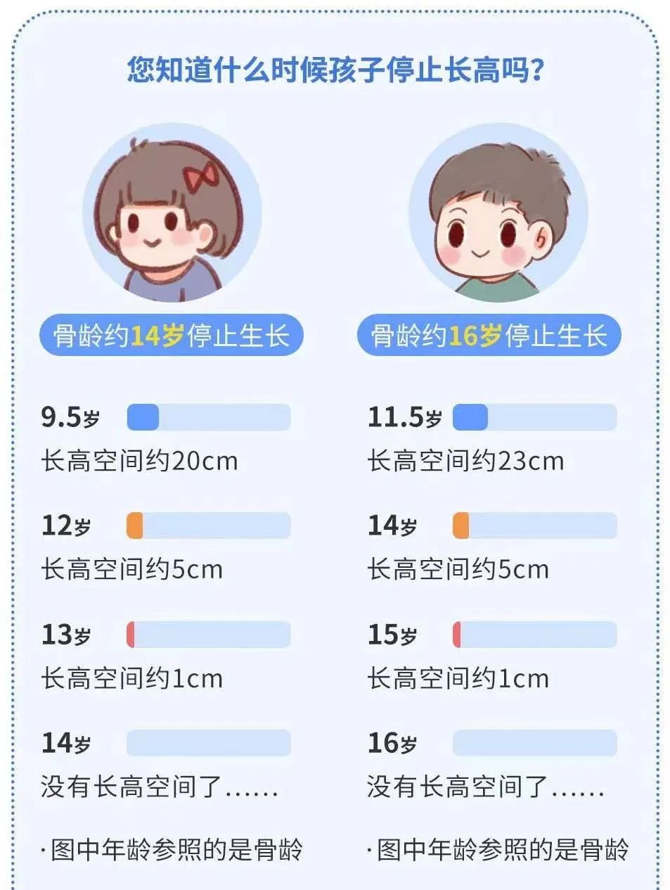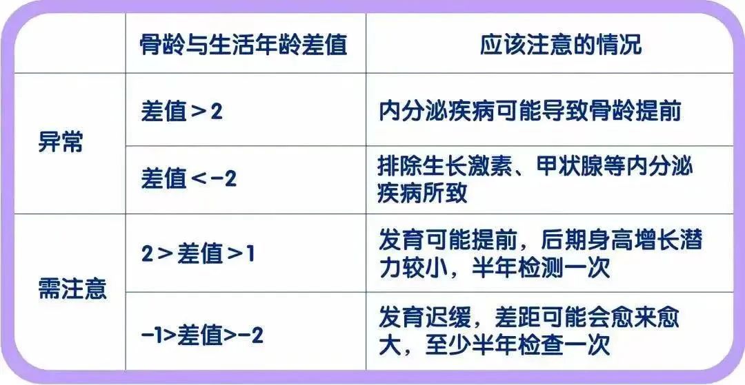 骨龄<年龄:在正常差值范围内,骨龄小于年龄,身高的潜力和管理空间越大。