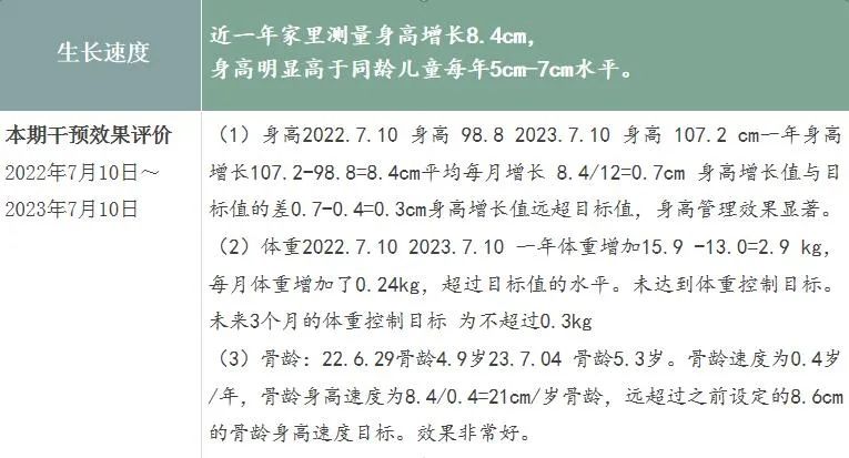 星星一家人对方案执行的很到位,这就是管与不管的差距。赵医生表示,虽然目前来看,体重控制稍差,但理想的是骨龄速度不快(一年只长了0.4岁骨龄)。之后严格按干预方案执行,确保体重增长在设定范围内,保持之前良好的骨龄进展速度,很容易实现165厘米的理想身高。