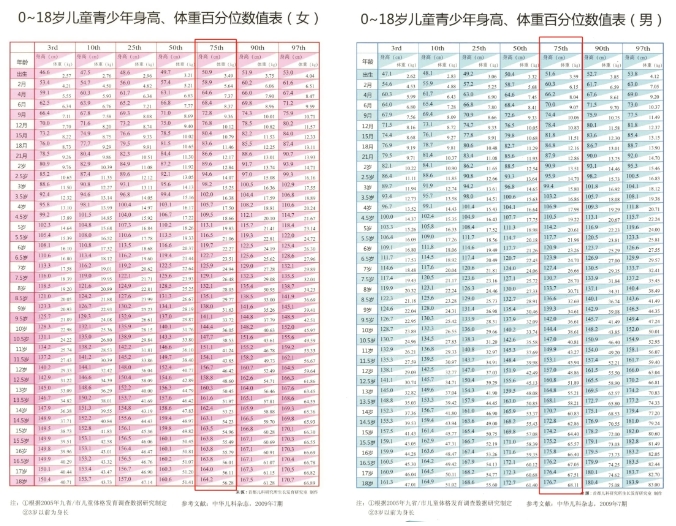 下面两张图是身高百分位表,在明确孩子的骨龄后,大家可以把最左侧竖列的年龄换成骨龄来看,孩子是不是能达到女孩165厘米成年身高,男孩175厘米成年身高?