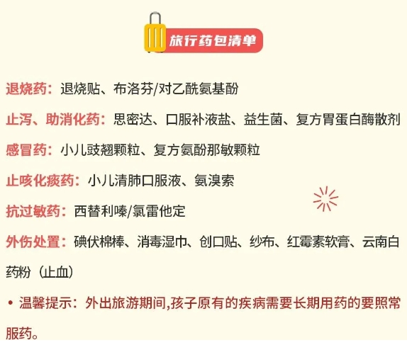 具体用药遵医嘱服用!!!除了带应急药外,还要注意不熟悉的食物,别乱吃。出发前,不要让孩子吃刺激性食物,应该按照平时饮食习惯,让孩子的肠胃保持健康的状态。到了目的地,在外就餐时注意饮食卫生。多吃蔬菜、水果。少吃含糖多、脂肪多、油炸等食物。可以自带新鲜水果、坚果、奶、奶制品、豆制品等营养丰富的食物,作为零食。