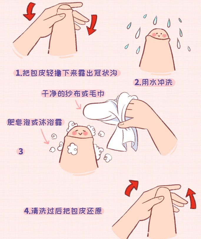 3、3岁后:随着阴茎体开始发育,大多数男孩的包皮和龟头间距离会逐渐拉宽,两者分离。三四岁后,包皮会自行向上退缩,外翻包皮,龟头会慢慢暴露出来。如果翻不过来建议就诊,请专科医生判断和处理。翻下包皮目的之一就是让孩子阴茎头可以完全显露出来,方便清洗。同时及时解开束缚阴茎发育的“紧身衣”,促进孩子阴茎发育。清洗包皮时,单手从阴茎中段朝根部方向轻推包皮,使龟头和冠状沟完全暴露出来后,用清水把里面的分泌物清理干净即可,不必使用特殊清洁剂与棉签,过度的清洁反而会造成刺激。家长要注意,清洗不要太粗暴,用力不要太大,尤其太疼很容易给孩子留下心理障碍和阴影。