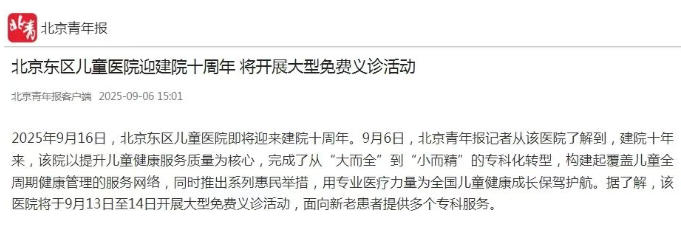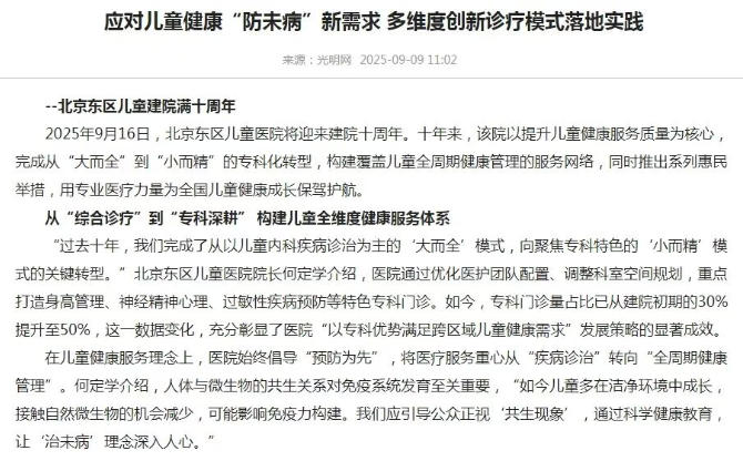 2025年9月16日,luck新利十周年院庆,中国网、光明网、中国新闻网、中国妇女报、生命时报、北京青年报等20家权威媒体以“医院应对儿童健康防未病新需求,多维度创新诊疗模式落地实践”为题进行报道。