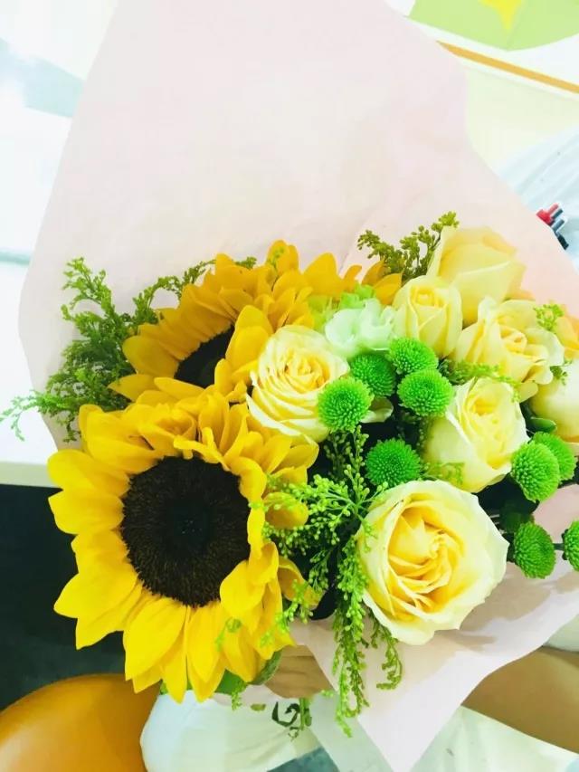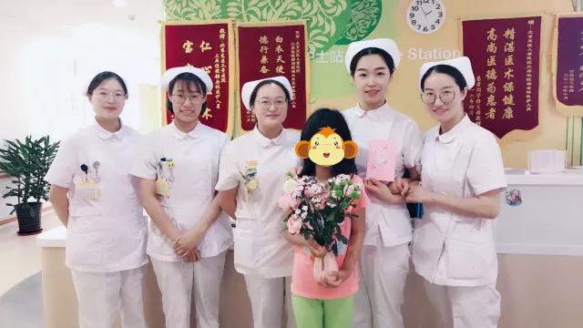 佳佳为护士姐姐们送上鲜花,护士姐姐们太阳花般的笑容带给佳佳力量
