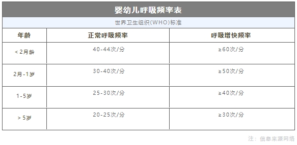 1. 观察呼吸变化:在孩子睡觉或者安静的时候,数孩子呼吸的次数,一呼一吸算一次,早中晚各数一次,连续着数三天。可以参照表中数据,同时还要观察有没有喘憋、呼吸费力、鼻翼煽动、口周发青,这四种呼吸困难的情况。