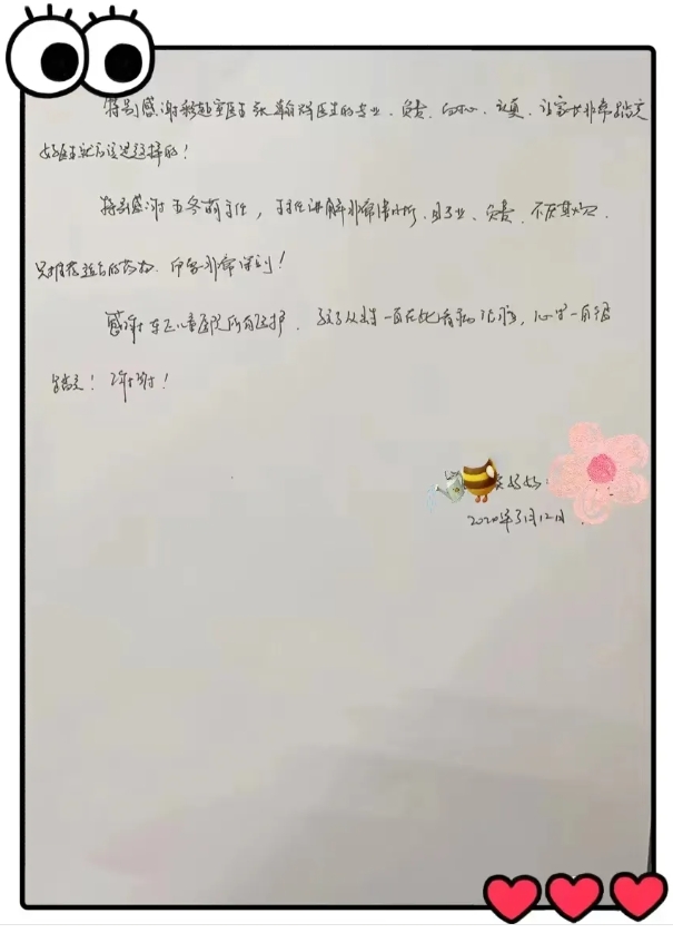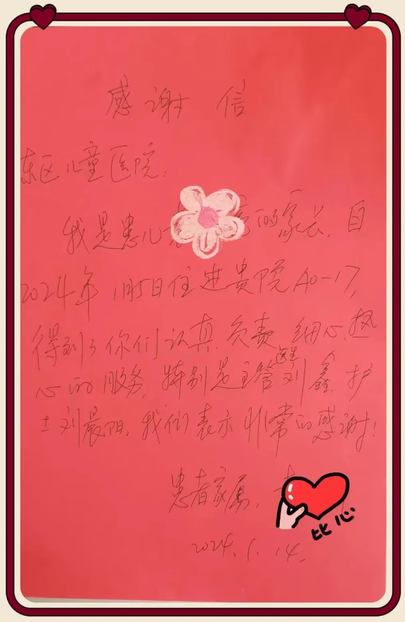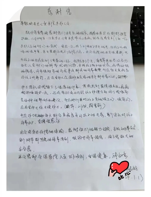 但是,家长听到淋巴结肿大的时候还是产生了焦虑,联想到了淋巴肿瘤,于是张医生耐心地和家长沟通解释,并用看图说话的方式让家长更清晰地了解孩子的病情。解除了家长的疑虑和恐惧心理,家长通过感谢信的方式表达了自己的感激之情。