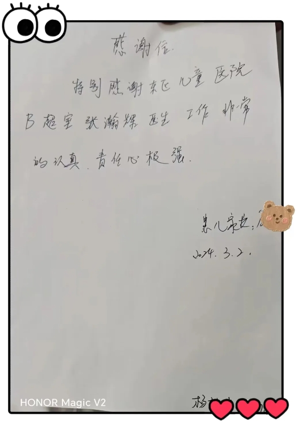 张瀚辉医生有爱、认真的工作态度,以及超声检查的专业度,不仅受到家长的认可。同时也被内科、外科的医生们连连称赞。(多次收到家长的感谢信和表扬)