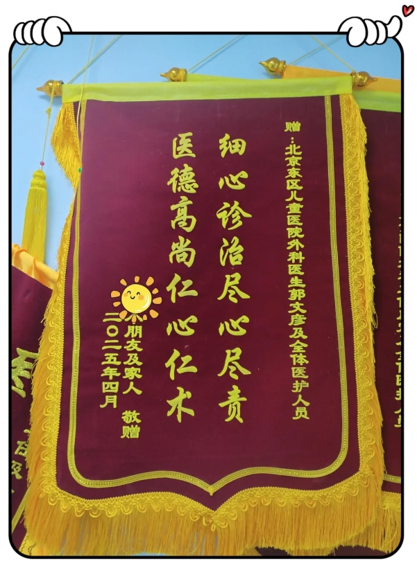 一周后复诊时,庞震主任详细询问孩子日常情况:“平时是不是大便干燥?还容易感冒?”家长连连点头。庞主任结合影像报告进一步解释:“肠道残留的干便需要几天排净,肠套叠复位后,肠管恢复血流炎症因子再灌注损伤、肠道细菌移位,会引起发烧,需要医生处理治疗。”通俗的解释就是,肠套叠复位后,因为之前被卡住的肠子突然恢复供血(就像憋久的水管突然通水),可能会有点“过激反应”,导致发烧。另外,被压过的肠子可能有“小伤口“,肠道里的细菌趁机入血溜到别处,也可能引起感染发烧。果然,孩子回家后症状变化与庞主任预判分毫不差,家长因提前知晓从容应对。家长特意给庞主任和郭医生各赠送了一面锦旗:“要不是庞主任团队技术高超,孩子可能就要挨一刀了!“